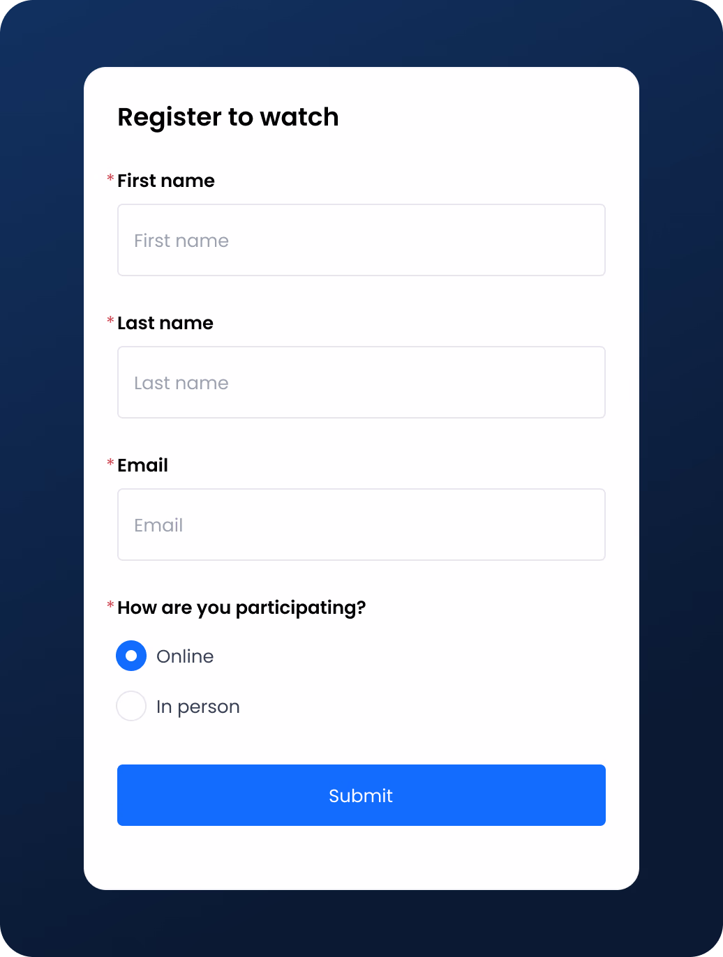 The registration form can be shared via a dedicated event page, or displayed as an overlay on any Qbrick video, including your meeting stream.